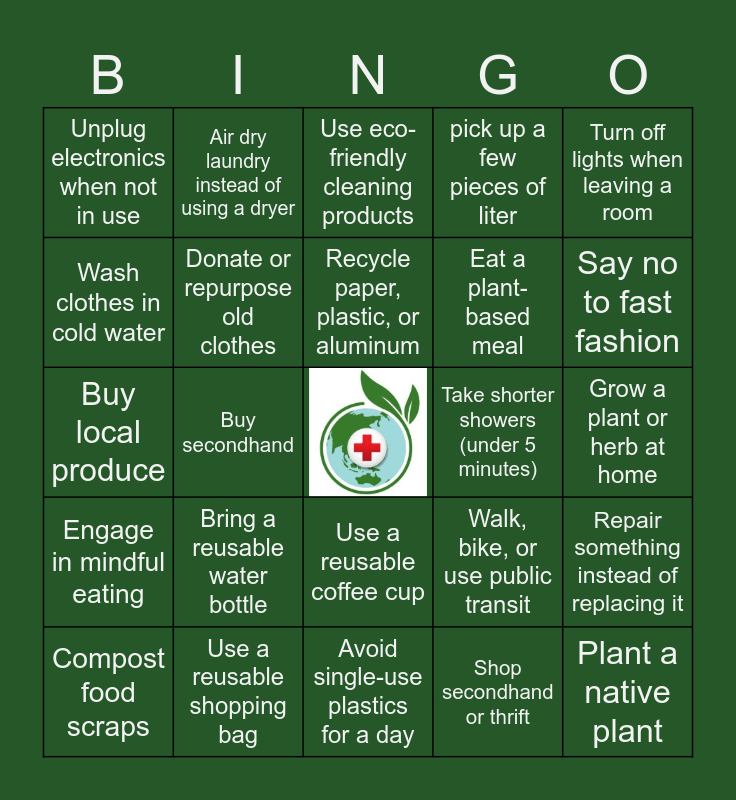 This bingo card has a free space and 24 words: Bring a reusable water bottle, Use a reusable shopping bag, Recycle paper, plastic, or aluminum, Compost food scraps, Turn off lights when leaving a room, Unplug electronics when not in use, Wash clothes in cold water, Air dry laundry instead of using a dryer, Take shorter showers (under 5 minutes), Use a reusable coffee cup, Eat a plant-based meal, Buy local produce, Walk, bike, or use public transit, Repair something instead of replacing it, Donate or repurpose old clothes, Shop secondhand or thrift, Grow a plant or herb at home, Use eco-friendly cleaning products, Say no to fast fashion, Buy secondhand, Plant a native plant, Engage in mindful eating, pick up a few pieces of liter and Avoid single-use plastics for a day.