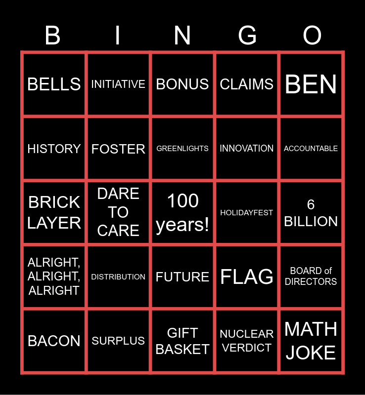 This bingo card has a free space and 36 words: TOMORROW, SURPRISE, RELATIONSHIP, FOSTER, FLAG, ALRIGHT, ALRIGHT, ALRIGHT, GREENLIGHTS, POEMS AND PRAYERS, BEN, CHOCOLATE, DARE TO CARE, CLAIMS, FUNFEST, HOLIDAYFEST, ACCOUNTABLE, BELLS, PROFITABILITY, DISTRIBUTION, MATH JOKE, BONUS, 6 BILLION, BOARD of DIRECTORS, SURPLUS, BACON, GIFT BASKET, INITIATIVE, BRICK LAYER, FAMILY, INNOVATION, HISTORY, LEGACY, CHANGE, NUCLEAR VERDICT, FUTURE, INSURED and BENEFITS.