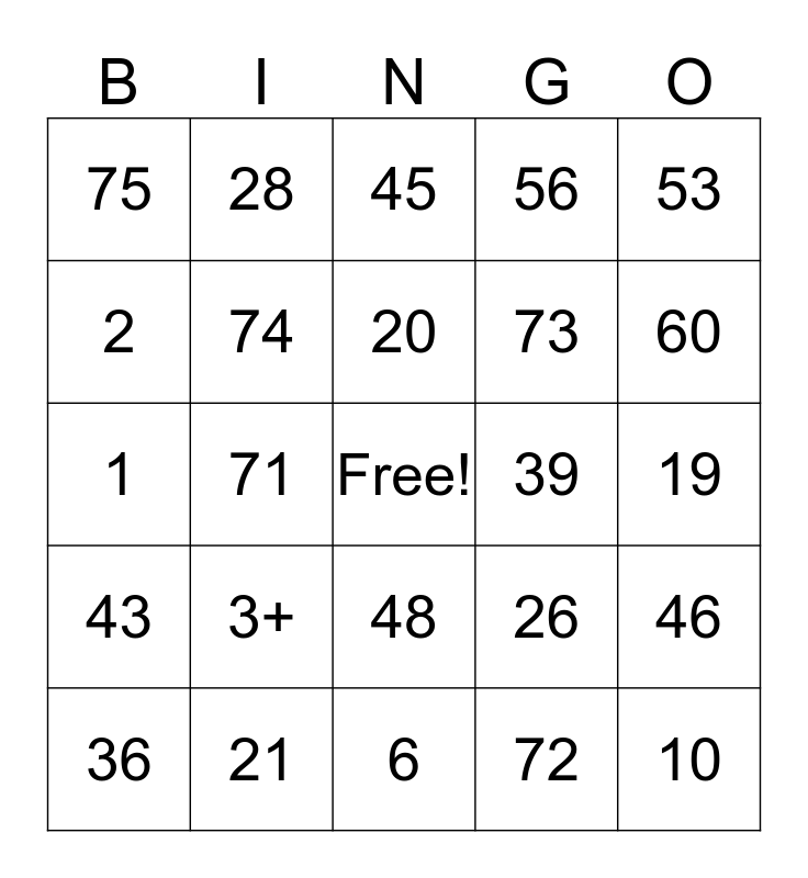 This bingo card has a free space and 25 words: 3+, 6, 20, 36, 53, 75, 2, 28, 39, 48, 73, 1, 26, 46, 74, 14, 19, 45, 60, 71, 10, 21, 43, 56 and 72.