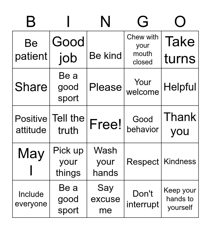 This bingo card has a free space and 25 words: Pick up your things, Say excuse me, Please, Include everyone, Take turns, Be patient, Share, Good job, Good behavior, Wash your hands, Your welcome, Positive attitude, Respect, Kindness, Be a good sport, Don't pass on rumors, Thank you, Be kind, Helpful, Tell the truth, Keep your hands to yourself, Be a good sport, May I, Chew with your mouth closed and Don't interrupt.
