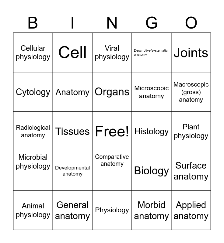 This bingo card has a free space and 24 words: Animal physiology, Developmental anatomy, Organs, Morbid anatomy, Joints, Cellular physiology, Cell, Viral physiology, Histology, Plant physiology, Radiological anatomy, Anatomy, Biology, Surface anatomy, Cytology, General anatomy, Physiology, Descriptive/systematic anatomy, Macroscopic (gross) anatomy, Microbial physiology, Tissues, Comparative anatomy, Microscopic anatomy and Applied anatomy.