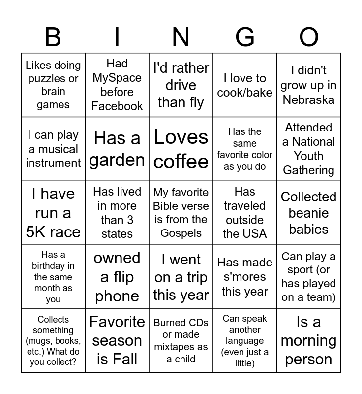 This bingo card has a free space and 35 words: My spouse and I have been married for more than 10 years, I met my spouse at church, I have a funny wedding story (and tell it!), Has a garden, I went on a trip this year, I love to cook/bake, I can play a musical instrument, I grew up LCMS, Loves coffee, My spouse and I have a go to date night spot (share what it is), I have run a 5K race, I didn't grow up in Nebraska, I have a pet, I went to college in Nebraska, Likes doing puzzles or brain games, Has traveled outside the USA, Can speak another language (even just a little), Has lived in more than 3 states, Has a birthday in the same month as you, Is a morning person, Has made s'mores this year, Collects something (mugs, books, etc.) What do you collect?, Can play a sport (or has played on a team), Favorite season is Fall, I'd rather drive than fly, Attended a National Youth Gathering, Can name all 12 disciples (prove it!), Can recite the Apostles Creed from memory (prove it!), Has the same favorite color as you do, Collected beanie babies, Remember dial up internet noises, Burned CDs or made mixtapes as a child, owned a flip phone, Had MySpace before Facebook and Watched Saturday morning cartoons as a kid.