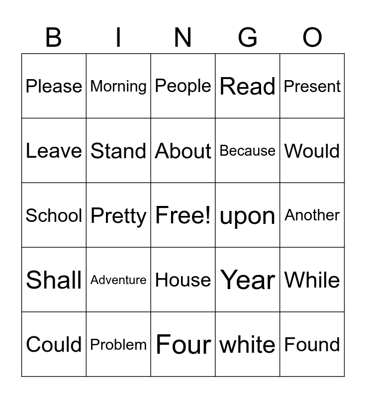 This bingo card has a free space and 24 words: Adventure, Problem, About, Could, Present, Please, Leave, Morning, upon, House, Because, School, Year, While, Stand, white, Another, People, Would, Pretty, Found, Shall, Read and Four.