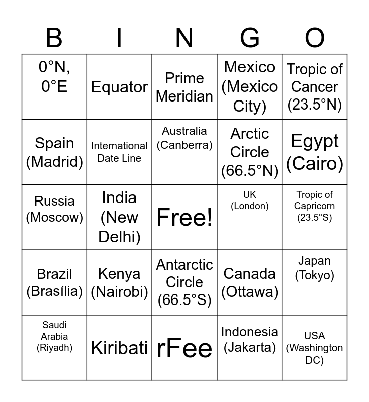 This bingo card has a free space and 24 words: Kenya (Nairobi), Kiribati, Australia (Canberra), Saudi Arabia (Riyadh), Tropic of Cancer (23.5°N), 0°N, 0°E, Spain (Madrid), Equator, UK (London), Antarctic Circle (66.5°S), Arctic Circle (66.5°N), Russia (Moscow), Canada (Ottawa), Japan (Tokyo), International Date Line, Indonesia (Jakarta), Tropic of Capricorn (23.5°S), Prime Meridian, Egypt (Cairo), India (New Delhi), USA (Washington DC), Brazil (Brasília), Mexico (Mexico City) and rFee.