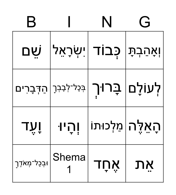 This bingo card has 21 words: Shema 1, שְׁמַע, יִשְׂרָאֵל, אֱלֹהֵינוּ, אֶחָד, בָּרוּךְ, שֵׁם, כְּבוֹד, מַלְכוּתוֹ, לְעוֹלָם, וָעֶד, וְאָהַבְתָּ, אֵת, אֱלֹהֶיךָ, בְּכָל־לְבָבְךָ, וּבְכָל־נַפְשְׁךָ, וּבְכָל־מְאֹדֶךָ, וְהָיוּ, הַדְּבָרִים, הָאֵלֶּה and אֲשֶׁר.