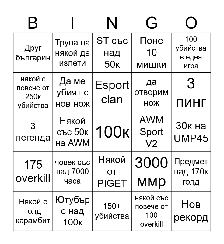 This bingo card has a free space and 24 words: човек със над 7000 часа, Ютубър с над 100к, Esport clan, Някой с голд карамбит, 100 убийства в една игра, Друг българин, някой с повече от 250к убийства, Трупа на някой да излети, АWM Sport V2, Някой от PIGET, да отворим нож, 3 легенда, 3000 ммр, Предмет над 170к голд, Да ме убият с нов нож, някой със повече от 100 overkill, 30к на UMP45, ST със над 50к, 3 пинг, Някой със 50к на AWM, Нов рекорд, 175 overkill, Поне 10 мишки and 150+ убийства.