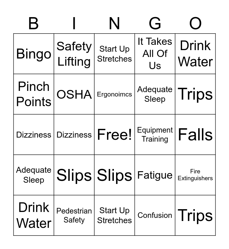 ⚠ This card has duplicate items: Wear Light Colors (2), Trips (2), Teamlift (2), Start Up Stretches (2), Slips (2), Safety Training (2), Safety Lifting (2), Safety Begings With ME (2), Pinch Points (2), Pedestrian Safety (2), OSHA (2), It Takes All Of Us (2), Fire Extinguishers (2), Fatigue (2), Falls (2), Evacuation Sites (2), Ergonoimcs (2), Equipment Training (2), Drive Safely (2), Drink Water (2), Dizziness (2), Confusion (2), Bingo (2), Adequate Sleep (2), Accident Free (2)