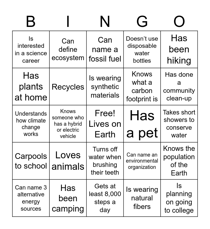 This bingo card has a free space and 24 words: Loves animals, Has been camping, Is wearing synthetic materials, Can name 3 alternative energy sources, Has been hiking, Is interested in a science career, Has plants at home, Can define ecosystem, Has a pet, Turns off water when brushing their teeth, Knows what a carbon footprint is, Understands how climate change works, Can name an environmental organization, Knows the population of the Earth, Recycles, Is wearing natural fibers, Takes short showers to conserve water, Can name a fossil fuel, Has done a community clean-up, Knows someone who has a hybrid or electric vehicle, Is planning on going to college, Carpools to school, Doesn’t use disposable water bottles and Gets at least 8,000 steps a day.