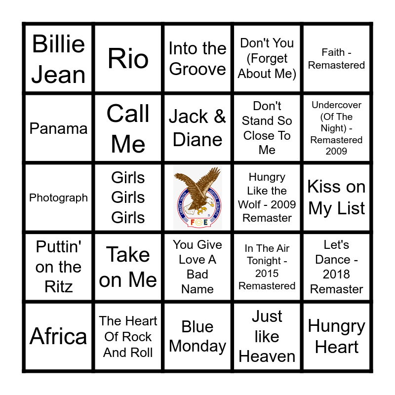 This bingo card has a free space and 55 words: 1999, Africa, Beat It, Billie Jean, Blue Monday, Burning Down the House, Call Me, Can't Fight This Feeling, Don't Stand So Close To Me, Don't Stop Believin', Don't You (Forget About Me), Don't You Want Me, Electric Avenue, Every Rose Has Its Thorn, Everybody Wants To Rule The World, Eye of the Tiger, Faith - Remastered, Girls Girls Girls, Girls Just Want to Have Fun, Hungry Heart, Hungry Like the Wolf - 2009 Remaster, I Want A New Drug, In The Air Tonight - 2015 Remastered, Into the Groove, It's Still Rock and Roll to Me, Jack & Diane, Just like Heaven, Keep on Loving You, Kiss on My List, Let's Dance - 2018 Remaster, Like a Virgin, Lovesong, Need You Tonight, Once in a Lifetime, Panama, Photograph, Pour Some Sugar On Me, Puttin' on the Ritz, Radio Free Europe, Refugee, Rio, Rosanna, Summer Of '69, Tainted Love, Take on Me, The Heart Of Rock And Roll, The One I Love, Time After Time, Under Pressure, Undercover (Of The Night) - Remastered 2009, Urgent, Welcome To The Jungle, When Doves Cry, You Give Love A Bad Name and You May Be Right.