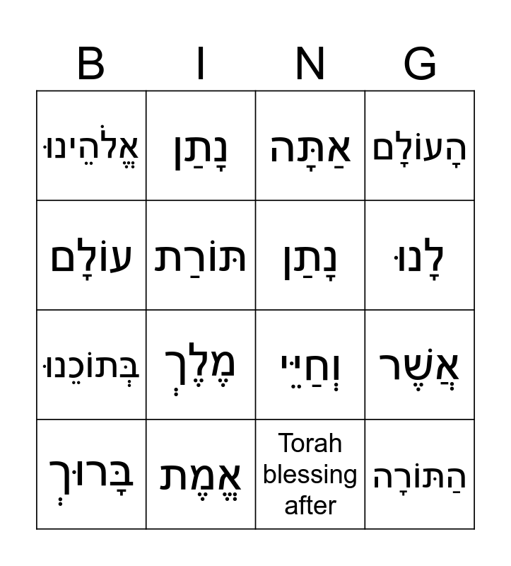 This bingo card has 17 words: Torah blessing after, בָּרוּךְ, אַתָּה, אֱלֹהֵינוּ, מֶלֶךְ, הָעוֹלָם, אֲשֶׁר, נָתַן, לָנוּ, תּוֹרַת, אֱמֶת, וְחַיֵּי, עוֹלָם, נָתַן, בְּתוֹכֵנוּ, נוֹתֵן and הַתּוֹרָה.