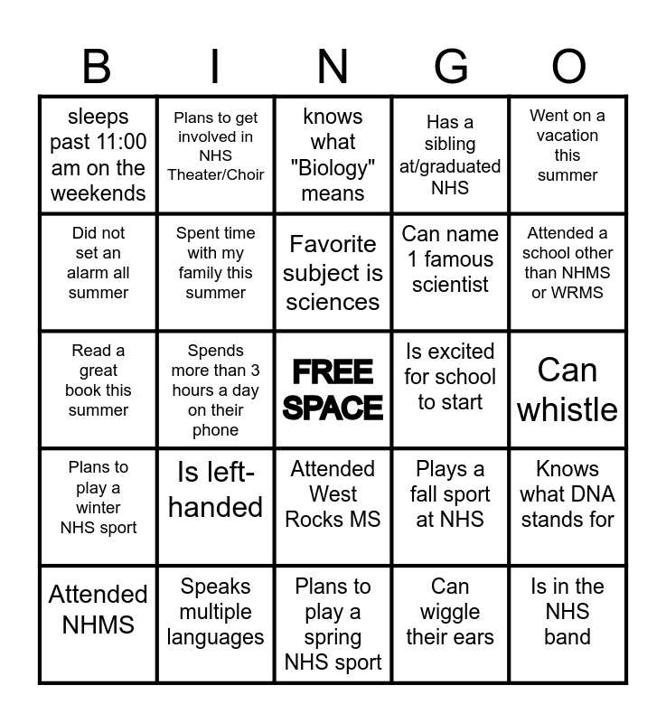 This bingo card has a free space and 24 words: Attended NHMS, Is left-handed, Favorite subject is sciences, Can wiggle their ears, Went on a vacation this summer, sleeps past 11:00 am on the weekends, Plans to get involved in NHS Theater/Choir, knows what "Biology" means, Is excited for school to start, Can whistle, Read a great book this summer, Spent time with my family this summer, Plays a fall sport at NHS, Knows what DNA stands for, Did not set an alarm all summer, Speaks multiple languages, Plans to play a spring NHS sport, Has a sibling at/graduated NHS, Attended a school other than NHMS or WRMS, Plans to play a winter NHS sport, Spends more than 3 hours a day on their phone, Attended West Rocks MS, Can name 1 famous scientist and Is in the NHS band.