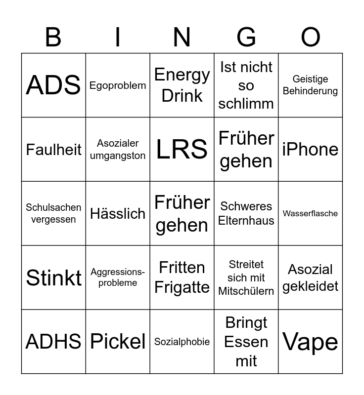 This bingo card has 25 words: Aggressions- probleme, Sozialphobie, LRS, ADHS, Geistige Behinderung, ADS, Faulheit, Egoproblem, Schweres Elternhaus, Fritten Frigatte, Früher gehen, Schulsachen vergessen, Streitet sich mit Mitschülern, Asozial gekleidet, Asozialer umgangston, Vape, Wasserflasche, Energy Drink, iPhone, Hässlich, Früher gehen, Pickel, Stinkt, Ist nicht so schlimm and Bringt Essen mit.
