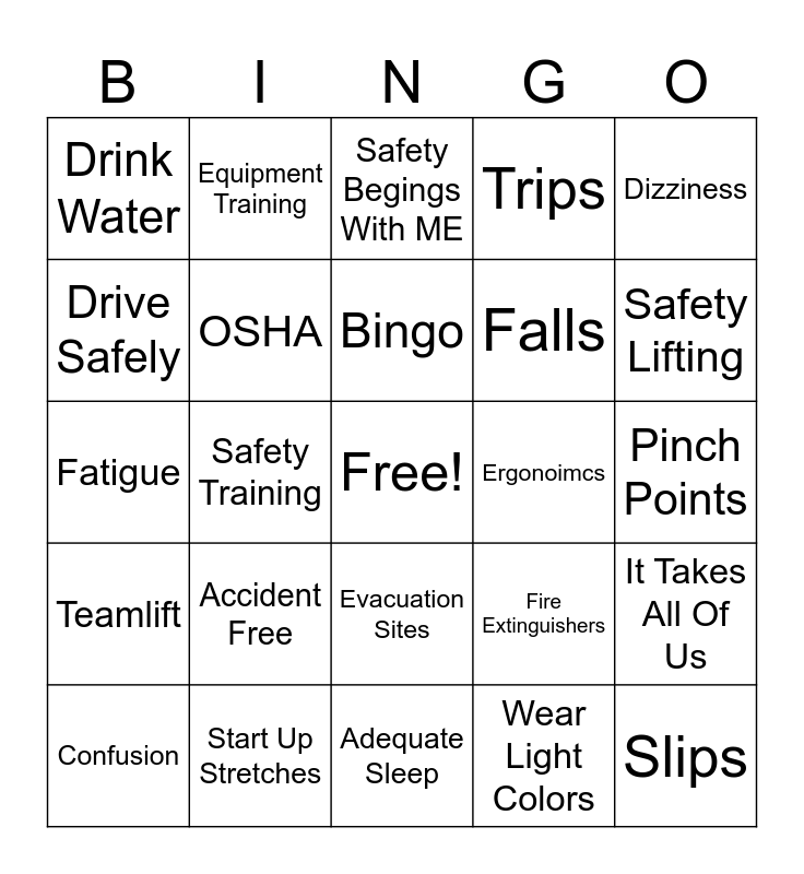This bingo card has a free space and 25 words: Accident Free, Adequate Sleep, Bingo, Confusion, Dizziness, Drink Water, Drive Safely, Equipment Training, Ergonoimcs, Evacuation Sites, Falls, Fatigue, Fire Extinguishers, It Takes All Of Us, OSHA, Pedestrian Safety, Pinch Points, Safety Begings With ME, Safety Lifting, Safety Training, Slips, Start Up Stretches, Teamlift, Trips and Wear Light Colors.