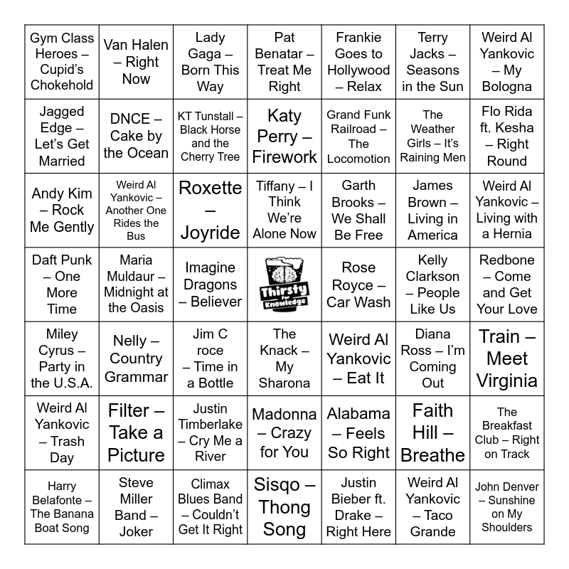 This bingo card has a free space and 100 words: Aerosmith – Livin’ on the Edge, Alabama – Feels So Right, Andy Kim – Rock Me Gently, Ashford & Simpson – Solid, Bananarama – Cruel Summer, Beatles – Strawberry Fields Forever, Bikini Kill – Rebel Girl, Billie Eilish – Lunch, Billy Joel – You May Be Right, Bow Wow Wow – I Want Candy, Brooks & Dunn – Hard Working Man, Carpenters – We’ve Only Just Begun, Climax Blues Band – Couldn’t Get It Right, Daft Punk – One More Time, Destiny’s Child – Jumpin’, Jumpin’, Diana Ross – I’m Coming Out, DNCE – Cake by the Ocean, Doja Cat ft. Weeknd – You Right, Dove Cameron – Boyfriend, Elton John – Bennie and the Jets, Elton John – Crocodile Rock, Eurythmics – Here Comes the Rain Again, Faith Hill – Breathe, Fall Out Boy – Sugar, We’re Going Down, Filter – Take a Picture, Flo Rida ft. Kesha – Right Round, Frankie Goes to Hollywood – Relax, Garth Brooks – We Shall Be Free, Gerardo – Rico Suave, Gerry Rafferty – Right Down the Line, Grand Funk Railroad – The Locomotion, Gym Class Heroes – Cupid’s Chokehold, Hall & Oates – Out of Touch, Harry Belafonte – The Banana Boat Song, Imagine Dragons – Believer, Jagged Edge – Let’s Get Married, James Brown – Living in America, Jay and the Americans – Come a Little Bit Closer, Jim Croce – Time in a Bottle, John Denver – Sunshine on My Shoulders, Justin Bieber ft. Drake – Right Here, Justin Timberlake – Cry Me a River, Katy Perry – Firework, Kelly Clarkson – People Like Us, KT Tunstall – Black Horse and the Cherry Tree, Lady Gaga – Born This Way, Lonestar – Amazed, Madonna – Crazy for You, Madonna – Vogue, Maria Muldaur – Midnight at the Oasis, Michael Jackson – Beat It, Miley Cyrus – Party in the U.S.A., Nelly – Country Grammar, Nelly – Hot in Herre, Next – Wifey, Nine Days – Absolutely (Story of a Girl), NSYNC – It’s Gonna Be Me, OutKast – Ms. Jackson, Paper Lace – The Night Chicago Died, Pat Benatar – Treat Me Right, Paul McCartney and Wings – Band on the Run, Pink – Raise Your Glass, Post Malone – Circles, Prince – Raspberry Beret, Queen – Another One Bites the Dust, Queen – Crazy Little Thing Called Love, Queen – I Want to Break Free, Redbone – Come and Get Your Love, Rihanna ft. David Guetta – Right Now, Robin Thicke ft. T.I., Pharrell – Blurred Lines, Rose Royce – Car Wash, Roxette – Joyride, Sam & Dave – Soul Man, Sia – Chandelier, Sisqo – Thong Song, Steve Miller Band – Joker, Sylvester – You Make Me Feel (Mighty Real), Terry Jacks – Seasons in the Sun, The Breakfast Club – Right on Track, The Knack – My Sharona, The Presidents of the United States of America – Peaches, The Weather Girls – It’s Raining Men, The White Stripes – Seven Nation Army, Tiffany – I Think We’re Alone Now, Train – Meet Virginia, Van Halen – Right Now, Vertical Horizon – Everything You Want, Village People – Go West, Warrant – Cherry Pie, Weird Al Yankovic – Another One Rides the Bus, Weird Al Yankovic – Eat It, Weird Al Yankovic – I Think I’m a Clone Now, Weird Al Yankovic – Livin’ in the Fridge, Weird Al Yankovic – Living with a Hernia, Weird Al Yankovic – My Bologna, Weird Al Yankovic – Party in the CIA, Weird Al Yankovic – Taco Grande, Weird Al Yankovic – Trash Day, Weird Al Yankovic – Word Crimes and Zedd ft. Aloe Blacc – Candyman.