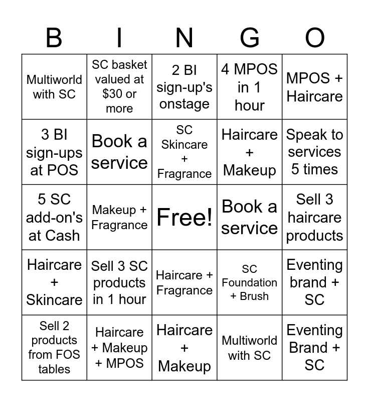 This bingo card has a free space and 24 words: Sell 3 SC products in 1 hour, Haircare + Makeup + MPOS, SC Skincare + Fragrance, Sell 2 products from FOS tables, MPOS + Haircare, Multiworld with SC, 3 BI sign-ups at POS, SC basket valued at $30 or more, Book a service, Haircare + Fragrance, Haircare + Makeup, 5 SC add-on's at Cash, SC Foundation + Brush, Eventing brand + SC, Book a service, Multiworld with SC, Sell 3 haircare products, 2 BI sign-up's onstage, Speak to services 5 times, Makeup + Fragrance, Eventing Brand + SC, Haircare + Skincare, 4 MPOS in 1 hour and Haircare + Makeup.