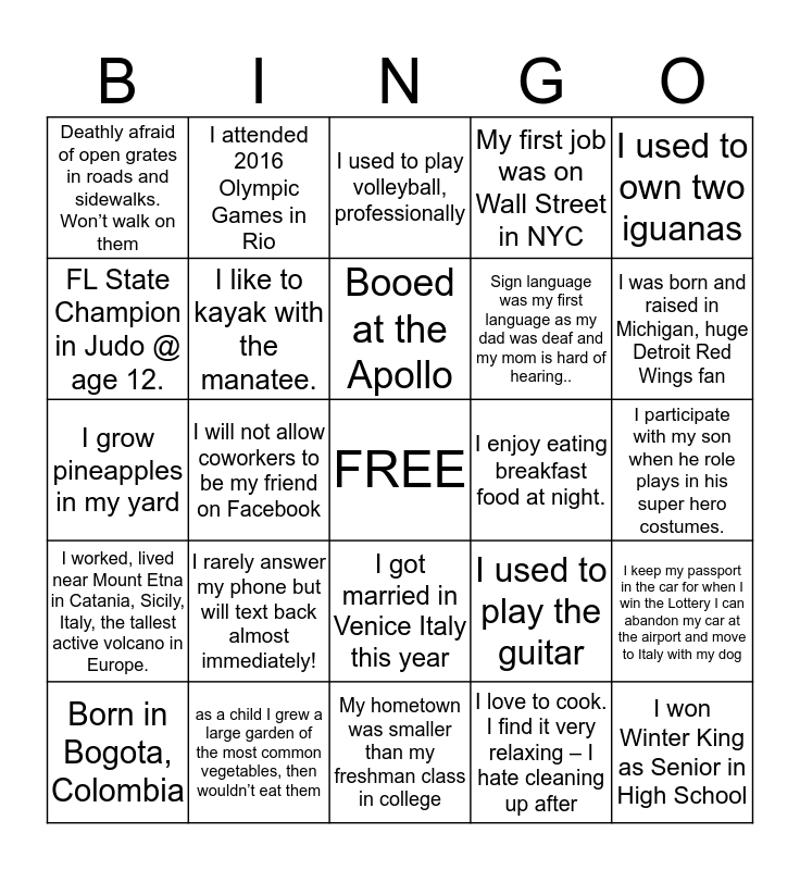 This bingo card has a free space and 24 words: I rarely answer my phone but will text back almost immediately!, as a child I grew a large garden of the most common vegetables, then wouldn’t eat them, Booed at the Apollo, Born in Bogota, Colombia, I used to own two iguanas, Deathly afraid of open grates in roads and sidewalks. Won’t walk on them, FL State Champion in Judo @ age 12., I attended 2016 Olympic Games in Rio, I enjoy eating breakfast food at night., I got married in Venice Italy this year, Sign language was my first language as my dad was deaf and my mom is hard of hearing.., I grow pineapples in my yard, I used to play the guitar, I keep my passport in the car for when I win the Lottery I can abandon my car at the airport and move to Italy with my dog, I like to kayak with the manatee., I love to cook. I find it very relaxing – I hate cleaning up after, I participate with my son when he role plays in his super hero costumes., I used to play volleyball, professionally, I was born and raised in Michigan, huge Detroit Red Wings fan, I will not allow coworkers to be my friend on Facebook, I won Winter King as Senior in High School, I worked, lived near Mount Etna in Catania, Sicily, Italy, the tallest active volcano in Europe., My first job was on Wall Street in NYC and My hometown was smaller than my freshman class in college.