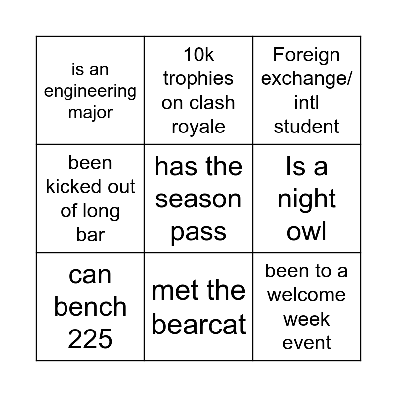 This bingo card has a free space and 8 words: Is a night owl, Foreign exchange/ intl student, 10k trophies on clash royale, can bench 225, is an engineering major, been to a welcome week event, been kicked out of long bar and met the bearcat.