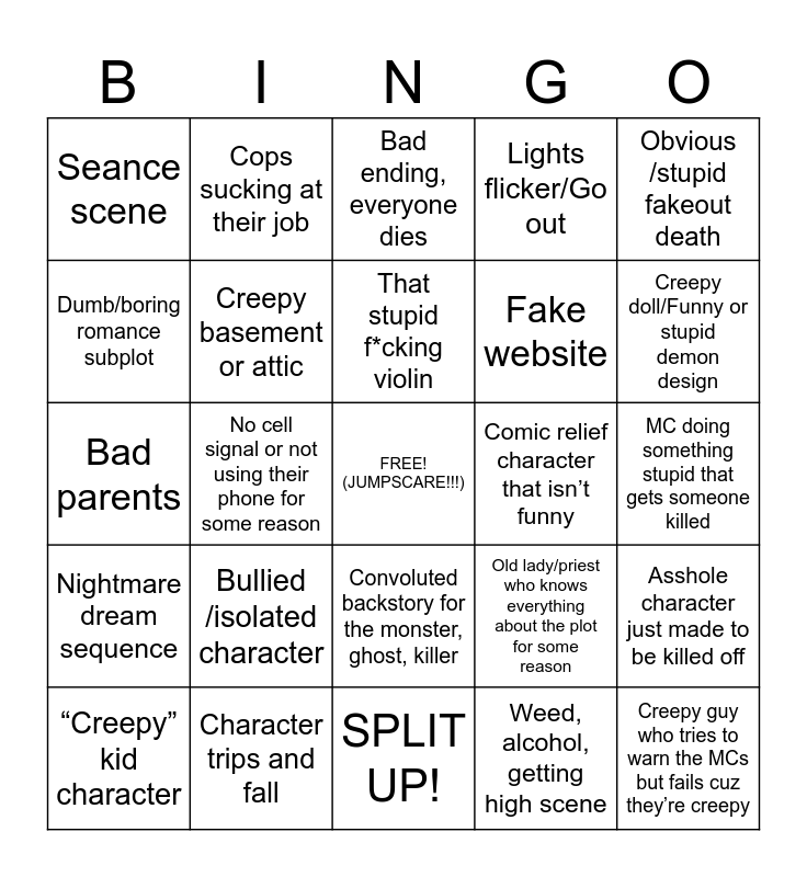 This bingo card has a free space and 24 words: Bullied /isolated character, Character trips and fall, That stupid f*cking violin, “Creepy” kid character, Obvious /stupid fakeout death, Seance scene, Dumb/boring romance subplot, Cops sucking at their job, Comic relief character that isn’t funny, Convoluted backstory for the monster, ghost, killer, Fake website, Bad parents, Old lady/priest who knows everything about the plot for some reason, Asshole character just made to be killed off, Creepy basement or attic, Weed, alcohol, getting high scene, MC doing something stupid that gets someone killed, Bad ending, everyone dies, Creepy doll/Funny or stupid demon design, No cell signal or not using their phone for some reason, Creepy guy who tries to warn the MCs but fails cuz they’re creepy, Nightmare dream sequence, Lights flicker/Go out and SPLIT UP!.