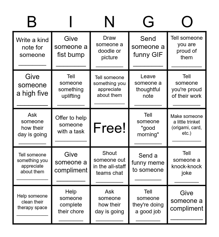 This bingo card has a free space and 24 words: Give someone a compliment ________, Help someone complete their chore ________, Tell someone something you appreciate about them ___________, Help someone clean their therapy space ____________, Tell someone you are proud of them __________, Write a kind note for someone ________, Give someone a high five ________, Give someone a fist bump ________, Tell someone "good morning" _________, Shout someone out in the all-staff teams chat _________, Leave someone a thoughtful note _________, Ask someone how their day is going _________, Send a funny meme to someone ________, Tell someone a knock-knock joke ________, Tell someone something uplifting _________, Tell someone they're doing a good job ________, Make someone a little trinket (origami, card, etc.) ___________, Draw someone a doodle or picture _________, Tell someone you're proud of their work _________, Offer to help someone with a task __________, Give someone a compliment _________, Tell someone something you appreciate about them ____________, Send someone a funny GIF ________ and Ask someone how their day is going _________.