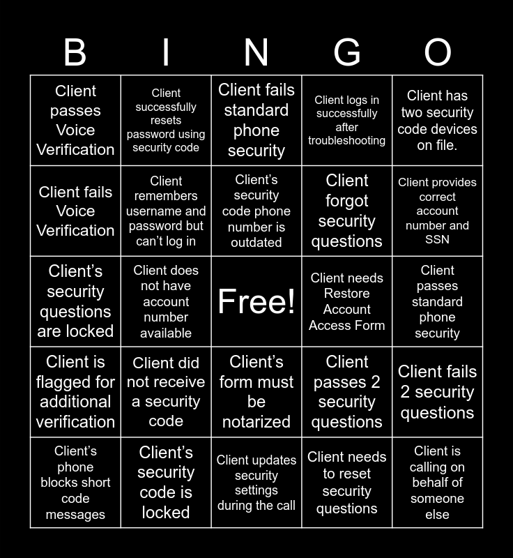 This bingo card has a free space and 24 words: Client did not receive a security code, Client’s security code is locked, Client’s security code phone number is outdated, Client’s phone blocks short code messages, Client has two security code devices on file., Client passes Voice Verification, Client fails Voice Verification, Client successfully resets password using security code, Client needs Restore Account Access Form, Client’s form must be notarized, Client forgot security questions, Client’s security questions are locked, Client passes 2 security questions, Client fails 2 security questions, Client remembers username and password but can’t log in, Client needs to reset security questions, Client passes standard phone security, Client fails standard phone security, Client provides correct account number and SSN, Client does not have account number available, Client is calling on behalf of someone else, Client is flagged for additional verification, Client logs in successfully after troubleshooting and Client updates security settings during the call.
