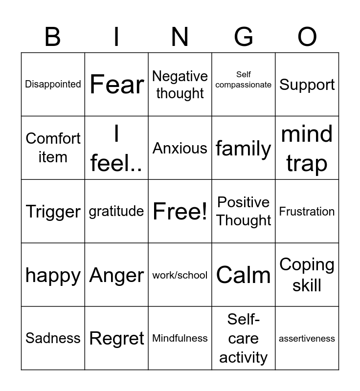 This bingo card has a free space and 24 words: Sadness, Anger, Anxious, Self-care activity, Support, Disappointed, Fear, Negative thought, Positive Thought, Frustration, Trigger, I feel.., Calm, Coping skill, Comfort item, Regret, Mindfulness, Self compassionate, mind trap, happy, gratitude, work/school, family and assertiveness.