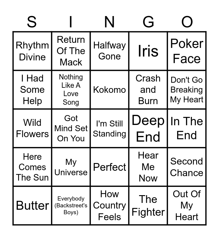 This bingo card has a free space and 41 words: Standing Next To You, Wild Flowers, Fearless, Nothing Like A Love Song, Everybody (Backstreet's Boys), Perfect, Kokomo, Never Gonna Give You Up, Poker Face, Here Comes The Sun, Got Mind Set On You, Iris, Out Of My Heart, In The End, Deep End, My Universe, On The Floor, Rhythm Divine, The Cup Of Life, Halfway Gone, Second Chance, She's Country, How Country Feels, Crash and Burn, Anything Goes, Blue Tacoma, The Fighter, Kick The Dust Up, Don't Go Breaking My Heart, We Will Rock You, Good Vibrations, Return Of The Mack, Butter, So What, Hear Me Now, I Had Some Help, Show Me Love, Main Attraction, Crush, Brave and Hey Hey Were The Monkees.