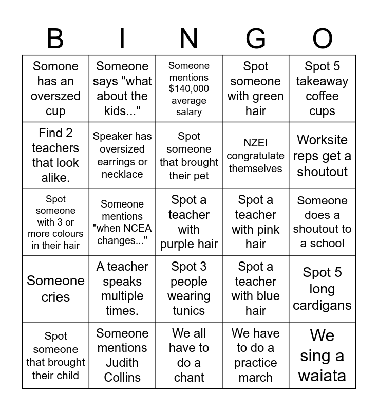 This bingo card has 30 words: Someone mentions Judith Collins, Spot an oversized lanyard, Someone mentions "when NCEA changes...", There is a tech issue, Somone has an overszed cup, Someone mentions $140,000 average salary, Speaker has oversized earrings or necklace, Spot 3 people wearing tunics, Spot a teacher with pink hair, We all have to do a chant, Someone does a shoutout to a school, Spot a teacher with purple hair, We have to do a practice march, We sing a waiata, Worksite reps get a shoutout, Spot 10 men wearing shorts, Spot a teacher with blue hair, Someone cries, A teacher speaks multiple times., Spot 5 takeaway coffee cups, Spot someone with 3 or more colours in their hair, Someone makes a hyperbolic statement about how hard it is being a teacher, Someone says "what about the kids...", NZEI congratulate themselves, Find 2 teachers that look alike., Spot someone with green hair, Spot 5 long cardigans, Spot someone that brought their child, Spot someone that brought their pet and Someone suggests a letter writing campaign.