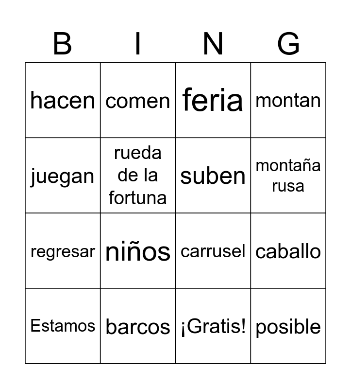 This bingo card has 17 words: ¡Gratis!, Estamos, feria, hacen, niños, montan, caballo, suben, montaña rusa, rueda de la fortuna, barcos, carrusel, juegan, comen, regresar, pronto and posible.