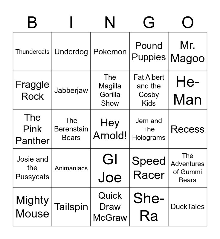 This bingo card has 36 words: Scooby Doo, School House Rock, Hong Kong Phooey, Jabberjaw, Speed Racer, Josie and the Pussycats, The Magilla Gorilla Show, The Smurfs, Mr. Magoo, The Flintstones, The Berenstain Bears, Pound Puppies, Saved By The Bell, Jem and The Holograms, He-Man, Thundercats, DuckTales, Animaniacs, Hey Arnold!, Pokemon, Recess, The Adventures of Gummi Bears, Tailspin, Mighty Mouse, Quick Draw McGraw, Underdog, The Pink Panther, Tom and Jerry, Fat Albert and the Cosby Kids, Fraggle Rock, My Little Pony, Rainbow Brite, She-Ra, GI Joe, Transformers and The Muppet Show.