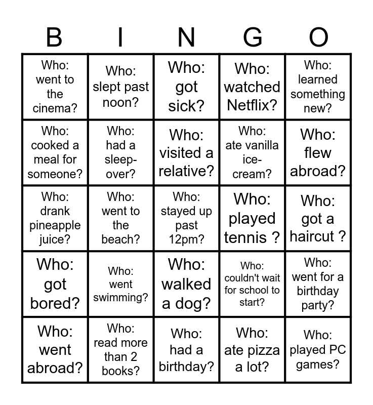 This bingo card has a free space and 24 words: Who: went swimming?, Who: read more than 2 books?, Who: visited a relative?, Who: went abroad?, Who: learned something new?, Who: went to the cinema?, Who: cooked a meal for someone?, Who: slept past noon?, Who: played tennis ?, Who: walked a dog?, Who: ate vanilla ice-cream?, Who: drank pineapple juice?, Who: couldn't wait for school to start?, Who: went for a birthday party?, Who: had a sleep-over?, Who: ate pizza a lot?, Who: got a haircut ?, Who: got sick?, Who: flew abroad?, Who: went to the beach?, Who: played PC games?, Who: got bored?, Who: watched Netflix? and Who: had a birthday?.