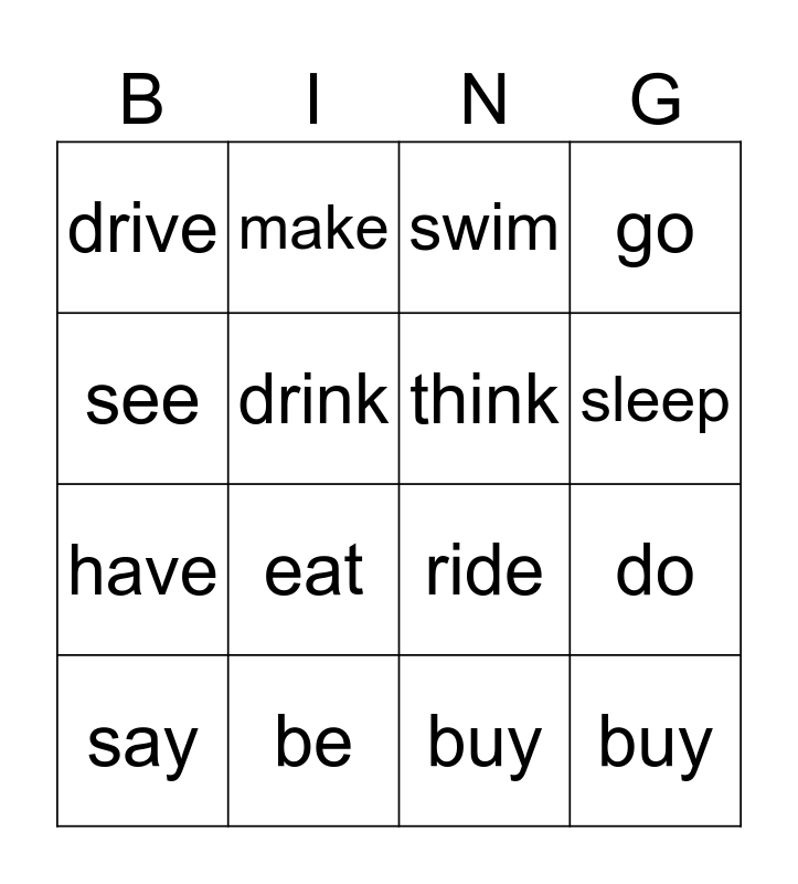 This bingo card has 16 words: be, do, swim, drive, have, make, ride, buy, see, drink, say, go, eat, sleep, think and buy.