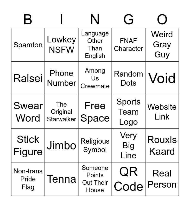 This bingo card has a free space and 24 words: Jimbo, Tenna, Among Us Crewmate, Non-trans Pride Flag, Weird Gray Guy, Spamton, Ralsei, Lowkey NSFW, Sports Team Logo, Religious Symbol, Random Dots, Swear Word, Very Big Line, Rouxls Kaard, Phone Number, QR Code, Website Link, Language Other Than English, Void, The Original Starwalker, Real Person, Stick Figure, FNAF Character and Someone Points Out Their House.
