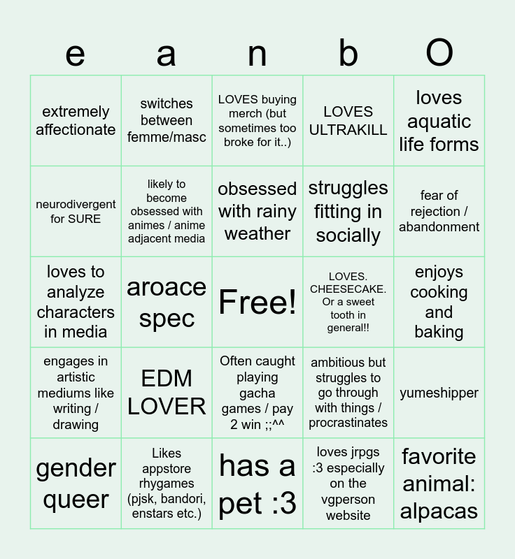This bingo card has a free space and 24 words: EDM LOVER, Likes appstore rhygames (pjsk, bandori, enstars etc.), obsessed with rainy weather, gender queer, loves aquatic life forms, extremely affectionate, neurodivergent for SURE, switches between femme/masc, LOVES. CHEESECAKE. Or a sweet tooth in general!!, Often caught playing gacha games / pay 2 win ;;^^, struggles fitting in socially, loves to analyze characters in media, ambitious but struggles to go through with things / procrastinates, yumeshipper, likely to become obsessed with animes / anime adjacent media, loves jrpgs :3 especially on the vgperson website, enjoys cooking and baking, LOVES buying merch (but sometimes too broke for it..), fear of rejection / abandonment, aroace spec, favorite animal: alpacas, engages in artistic mediums like writing / drawing, LOVES ULTRAKILL and has a pet :3.