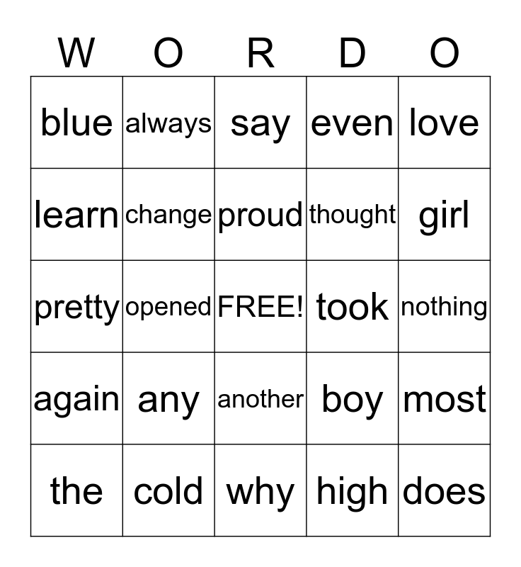 This bingo card has a free space and 24 words: any, cold, proud, the, love, blue, learn, always, took, another, thought, pretty, boy, most, change, high, nothing, say, girl, opened, does, again, even and why.
