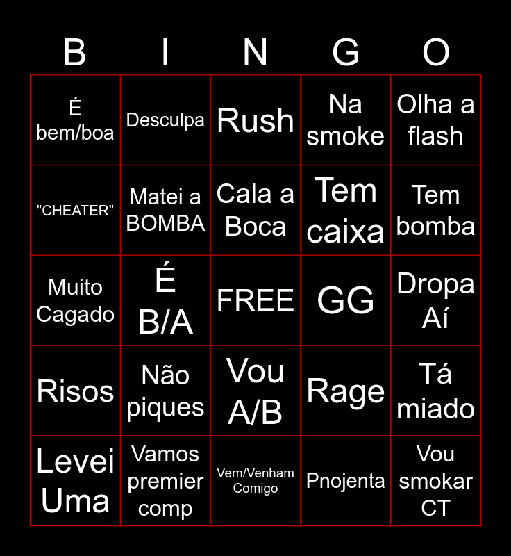 This bingo card has a free space and 24 words: Não piques, Vamos premier comp, Cala a Boca, Levei Uma, Olha a flash, É bem/boa, "CHEATER", Desculpa, GG, Vou A/B, Tem caixa, Muito Cagado, Rage, Tá miado, Matei a BOMBA, Pnojenta, Dropa Aí, Rush, Tem bomba, É B/A, Vou smokar CT, Risos, Na smoke and Vem/Venham Comigo.