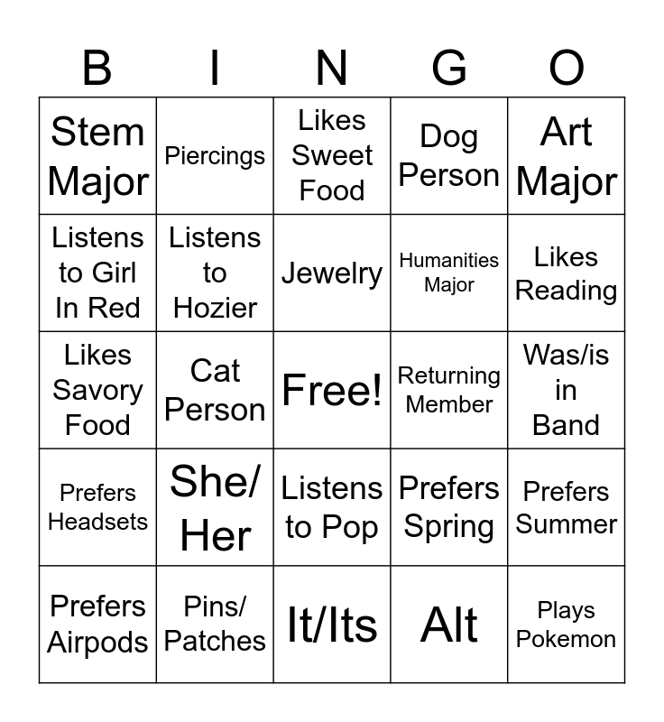 This bingo card has a free space and 49 words: Dyed Hair, Plays Pokemon, Prefers Winter, It/Its, She/ Her, They/ Them, Piercings, Pride Flag in Outfit, Listens to Girl In Red, Listens to Punk, Listens to Hozier, Dog Person, Prefers Summer, Prefers Spring, Prefers Fall, Plays D&D, Jewelry, Returning Member, New Member, Art Major, Cat Person, Alt, Stem Major, Humanities Major, Writes Poetry, Likes Reading, Prefers Airpods, Listens to Rap, Listens to Pop, Prefers Headsets, Watches/ Does Drag, Plays Minecraft, Plays Deltarune, Owns a Sword, Pins/ Patches, Vans, Single, In a Relationship, Was/is in Band, Was/is in Theatre, Was/is in Sports, Lives on Campus, Likes Spicy Food, Likes Sour Food, Likes Savory Food, Likes Sweet Food, Has Been to Pride, Pastels and Local.