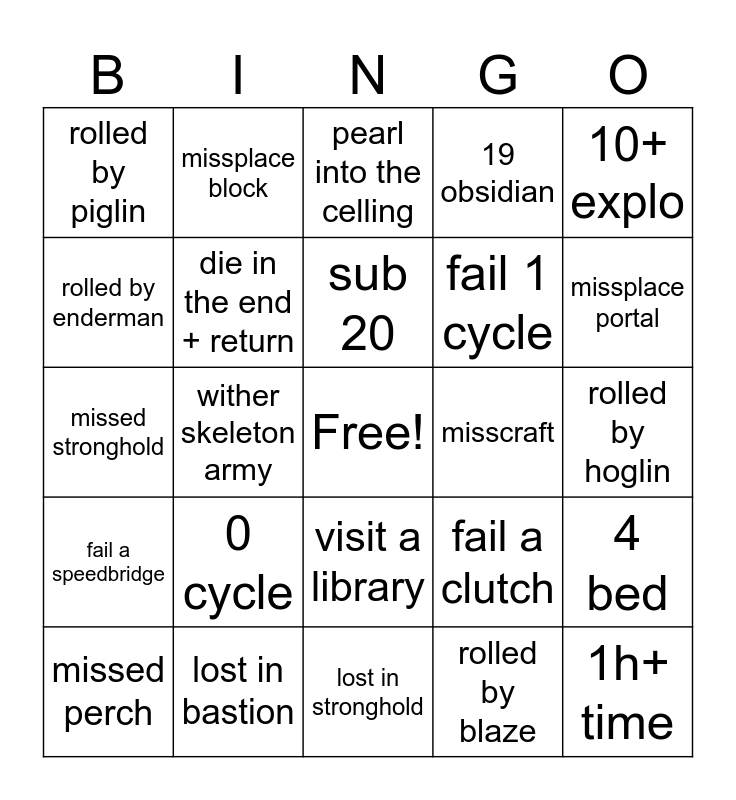 This bingo card has a free space and 24 words: 0 cycle, lost in bastion, sub 20, missed perch, 10+ explo, rolled by piglin, rolled by enderman, missplace block, misscraft, visit a library, fail 1 cycle, missed stronghold, fail a clutch, 4 bed, die in the end + return, rolled by blaze, rolled by hoglin, pearl into the celling, missplace portal, wither skeleton army, 1h+ time, fail a speedbridge, 19 obsidian and lost in stronghold.