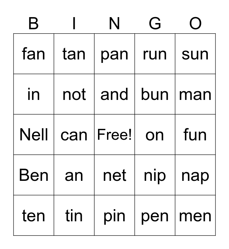 This bingo card has a free space and 24 words: an, tin, and, ten, sun, fan, in, tan, on, net, bun, Nell, nip, nap, not, pen, fun, pan, man, can, men, Ben, run and pin.