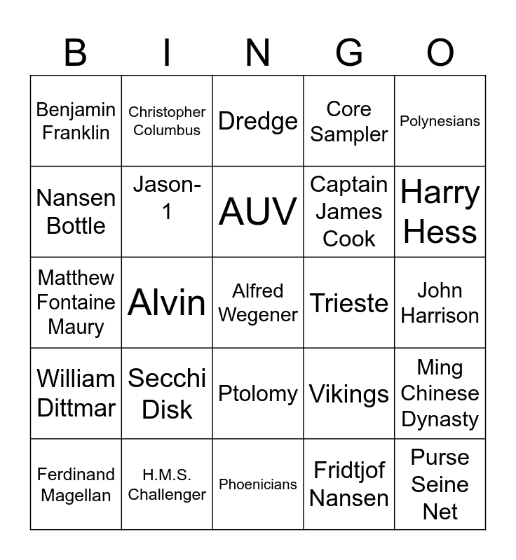 This bingo card has 25 words: Secchi Disk, Phoenicians, AUV, Ferdinand Magellan, Polynesians, Benjamin Franklin, Nansen Bottle, Christopher Columbus, Trieste, Ptolomy, Captain James Cook, Matthew Fontaine Maury, Vikings, Ming Chinese Dynasty, Jason-1, Purse Seine Net, John Harrison, Dredge, Harry Hess, Alvin, Alfred Wegener, H.M.S. Challenger, William Dittmar, Core Sampler and Fridtjof Nansen.