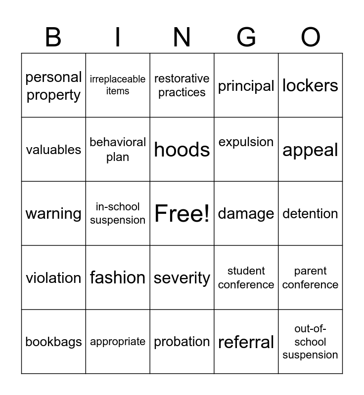 This bingo card has a free space and 24 words: fashion, appropriate, hoods, bookbags, lockers, personal property, valuables, irreplaceable items, damage, severity, expulsion, warning, student conference, parent conference, behavioral plan, referral, detention, restorative practices, appeal, in-school suspension, out-of-school suspension, violation, principal and probation.
