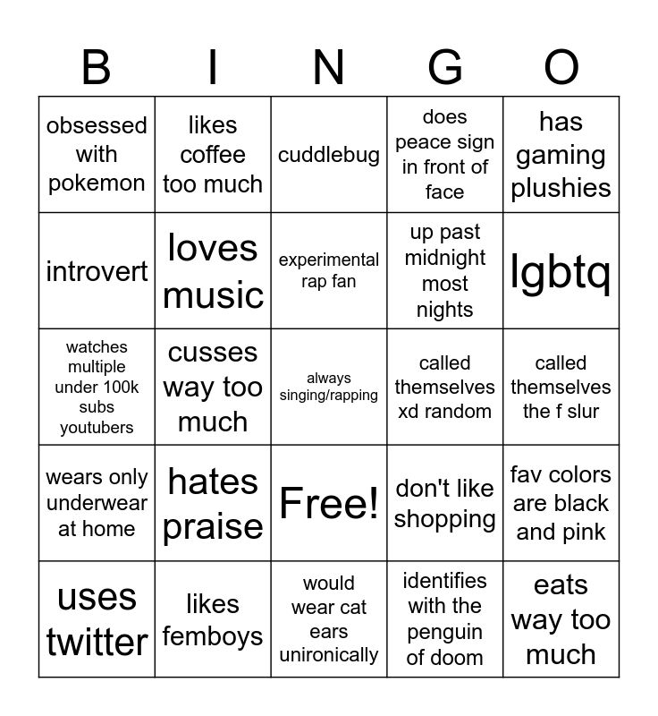 This bingo card has 26 words: Free!, identifies with the penguin of doom, experimental rap fan, likes femboys, has gaming plushies, obsessed with pokemon, introvert, likes coffee too much, called themselves the f slur, don't like shopping, up past midnight most nights, watches multiple under 100k subs youtubers, fav colors are black and pink, uses twitter, cusses way too much, sleeps with stuffed animal, does peace sign in front of face, wears only underwear at home, cuddlebug, always singing/rapping, lgbtq, would wear cat ears unironically, called themselves xd random, hates praise, loves music and eats way too much.
