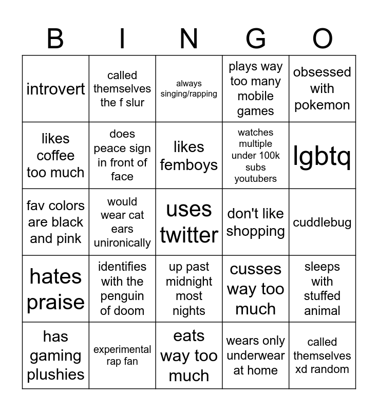 This bingo card has a free space and 24 words: identifies with the penguin of doom, experimental rap fan, likes femboys, has gaming plushies, obsessed with pokemon, introvert, likes coffee too much, called themselves the f slur, don't like shopping, up past midnight most nights, watches multiple under 100k subs youtubers, fav colors are black and pink, cusses way too much, sleeps with stuffed animal, does peace sign in front of face, wears only underwear at home, cuddlebug, always singing/rapping, lgbtq, would wear cat ears unironically, called themselves xd random, hates praise, plays way too many mobile games and eats way too much.
