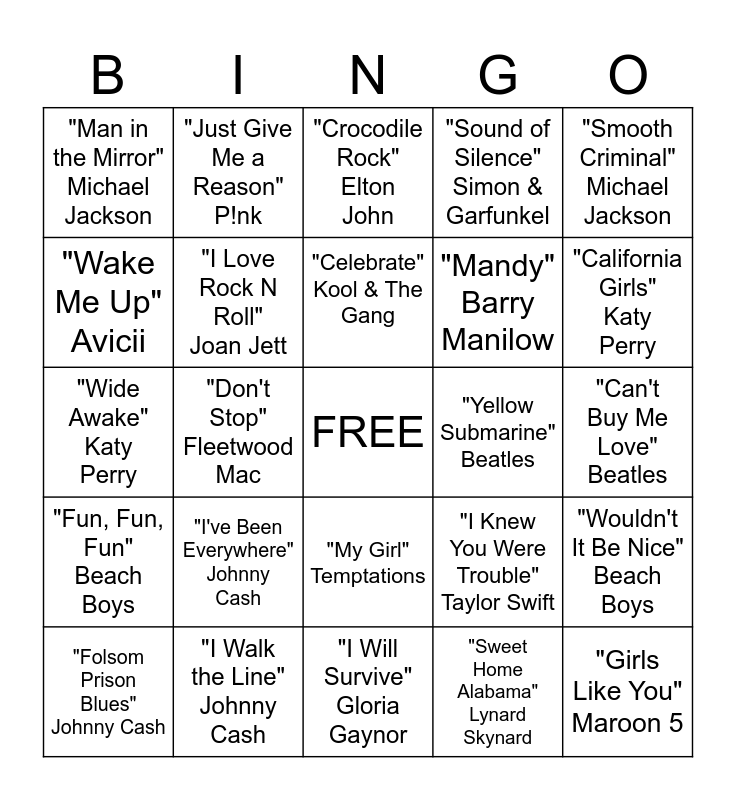 This bingo card has a free space and 24 words: "I've Been Everywhere" Johnny Cash, "I Walk the Line" Johnny Cash, "Celebrate" Kool & The Gang, "Folsom Prison Blues" Johnny Cash, "Smooth Criminal" Michael Jackson, "Man in the Mirror" Michael Jackson, "Wake Me Up" Avicii, "Just Give Me a Reason" P!nk, "Yellow Submarine" Beatles, "My Girl" Temptations, "Mandy" Barry Manilow, "Wide Awake" Katy Perry, "I Knew You Were Trouble" Taylor Swift, "Wouldn't It Be Nice" Beach Boys, "I Love Rock N Roll" Joan Jett, "Sweet Home Alabama" Lynard Skynard, "Can't Buy Me Love" Beatles, "Crocodile Rock" Elton John, "California Girls" Katy Perry, "Don't Stop" Fleetwood Mac, "Girls Like You" Maroon 5, "Fun, Fun, Fun" Beach Boys, "Sound of Silence" Simon & Garfunkel and "I Will Survive" Gloria Gaynor.