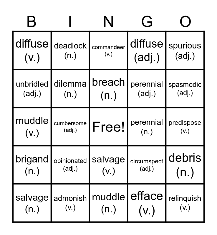 This bingo card has a free space and 24 words: opinionated (adj.), admonish (v.), breach (n.), salvage (n.), spurious (adj.), diffuse (v.), unbridled (adj.), deadlock (n.), perennial (n.), salvage (v.), perennial (adj.), muddle (v.), circumspect (adj.), debris (n.), dilemma (n.), efface (v.), predispose (v.), commandeer (v.), spasmodic (adj.), cumbersome (adj.), relinquish (v.), brigand (n.), diffuse (adj.) and muddle (n.).