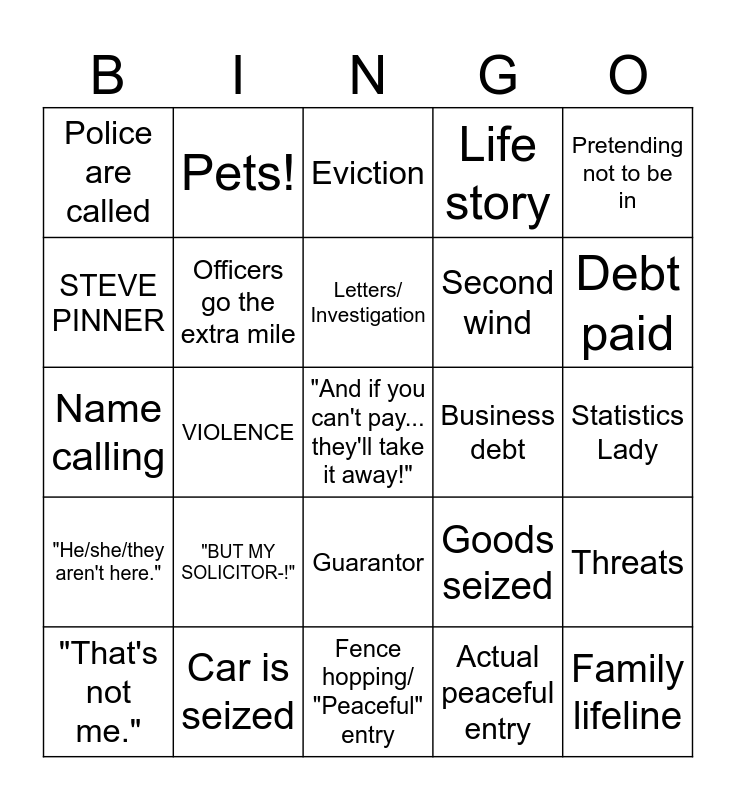 This bingo card has a free space and 29 words: "That's not me.", "That's not mine.", VIOLENCE, Yelling at the officers, Police are called, Eviction, Officers go the extra mile, "BUT MY SOLICITOR-!", Business debt, Car is seized, Statistics Lady, Family lifeline, Fence hopping/ "Peaceful" entry, Actual peaceful entry, Debt paid, Payment plan, Guarantor, "He/she/they aren't here.", Pretending not to be in, Name calling, Goods seized, PAUL BOHILL, Second wind, STEVE PINNER, Life story, Pets!, Threats, Letters/ Investigation and Statistics guy.