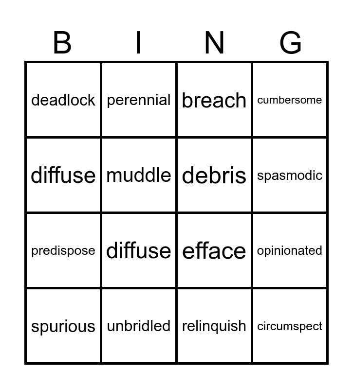 This bingo card has 20 words: opinionated, admonish, breach, salvage, spurious, diffuse, unbridled, deadlock, predispose, perennial, diffuse, efface, muddle, circumspect, debris, dilemma, spasmodic, cumbersome, relinquish and brigand.