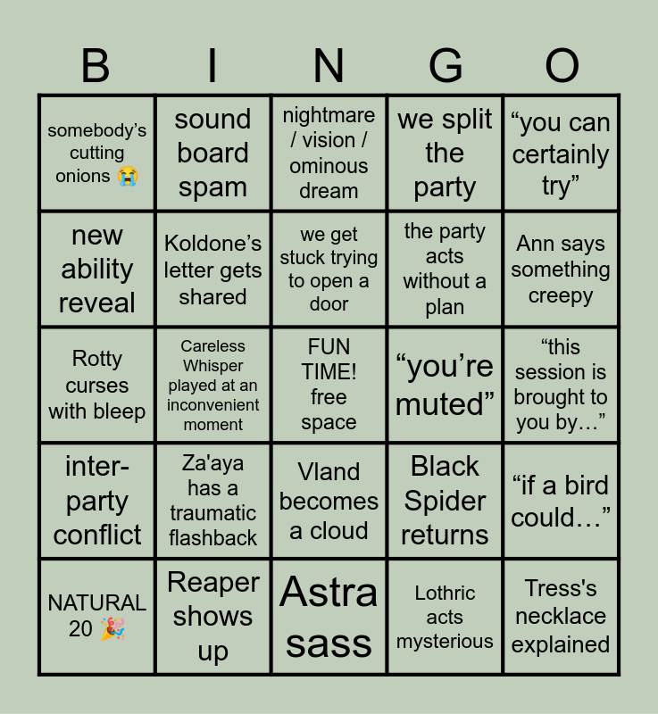 This bingo card has a free space and 29 words: NATURAL 20 🎉, critical fail 💀, Careless Whisper played at an inconvenient moment, roll initiative, somebody’s cutting onions 😭, nightmare / vision / ominous dream, Koldone’s letter gets shared, Za'aya has a traumatic flashback, “you’re muted”, Reaper shows up, “this session is brought to you by…”, Tress's necklace explained, Astra sass, Lothric acts mysterious, Ann says something creepy, Alec taunts someone, Vland becomes a cloud, inter-party conflict, “you can certainly try”, Rotty curses with bleep, Black Spider returns, captain / general / major salute, the party acts without a plan, new ability reveal, we split the party, sound board spam, “if a bird could…”, we get stuck trying to open a door and Alec & Astra are buds.