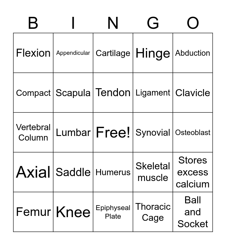 This bingo card has a free space and 27 words: Skeletal muscle, Vitamin D, Ligament, Epiphyseal Plate, Compact, Cartilage, Appendicular, Axial, Synovial, Stores excess calcium, Vertebral Column, Hinge, Femur, Knee, Clavicle, Skull, Scapula, Tendon, Saddle, Flexion, Osteoblast, Thoracic Cage, Lumbar, Ball and Socket, Humerus, Abduction and Adduction.
