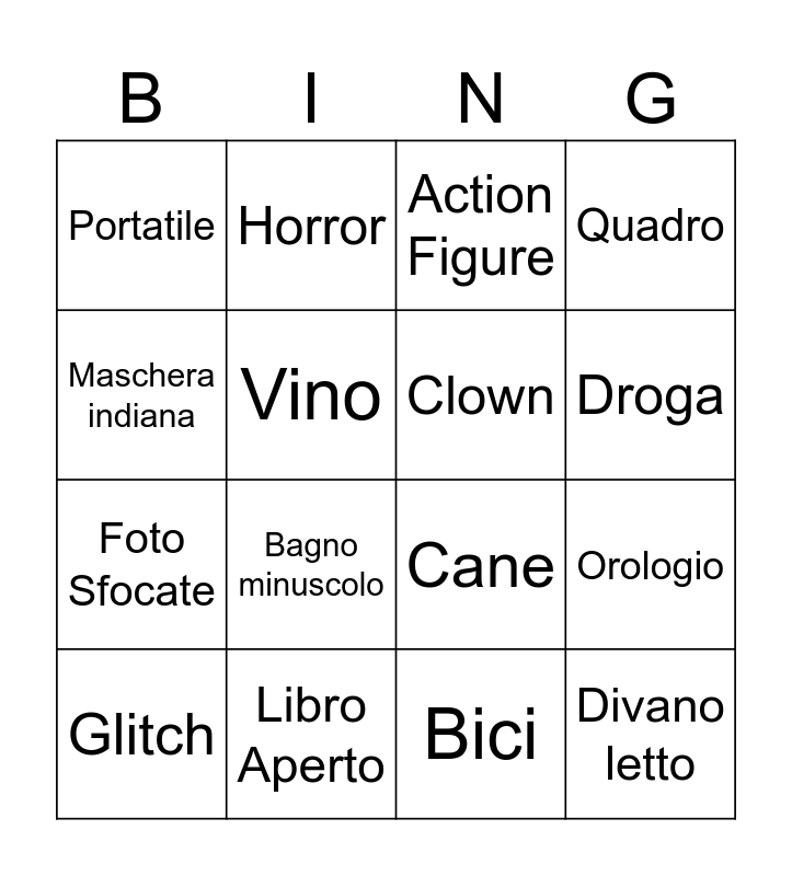 This bingo card has 18 words: Bagno minuscolo, Divano letto, Action Figure, Portatile, Cane, Quadro, Glitch, Horror, Droga, Foto Sfocate, Bici, Maschera indiana, Orologio, Vino, Clown, Fiori, Libro Aperto and Palla.