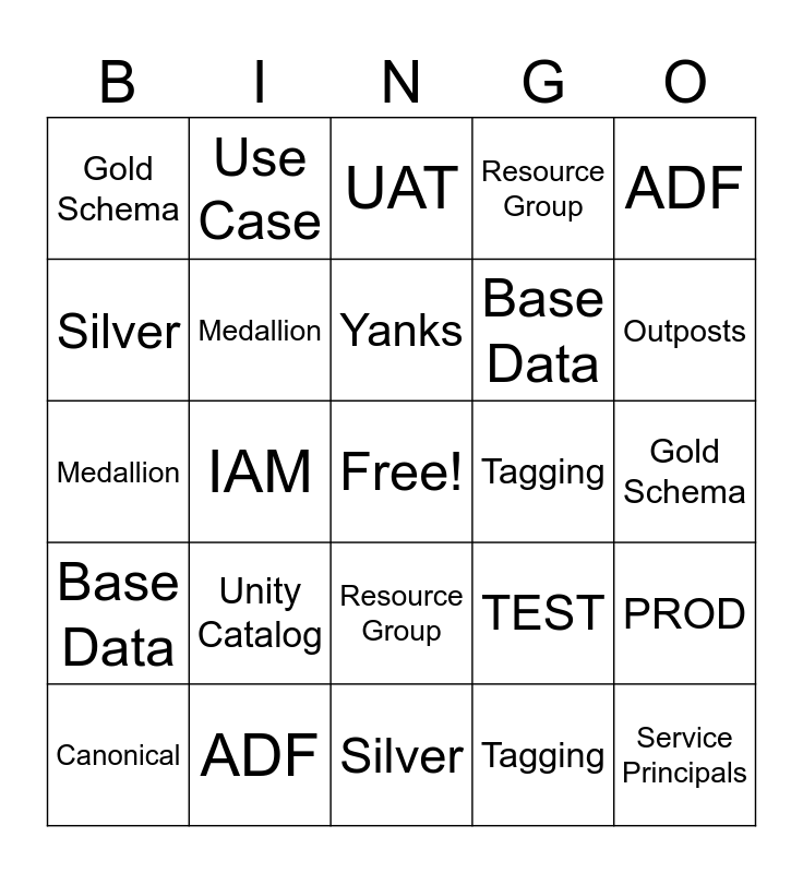This bingo card has a free space and 57 words: Master Data, Canonical, Gold Catalog, Gold Schema, Silver, Bronze, Medallion, Subscription, Base Data, Use Case, Resource Group, NONPROD, SOX, Catalog, RBAC, Unity Catalog, ADF, IAM, DABS, Service Principals, Tagging, DEV, TEST, UAT, PROD, Yanks, Brits, French, Outposts, Mesh, Brave New World, Master Data, Canonical, Gold Catalog, Gold Schema, Silver, Bronze, Medallion, Subscription, Base Data, Use Case, Resource Group, NONPROD, SOX, Catalog, RBAC, Unity Catalog, ADF, IAM, DABS, Service Principals, Tagging, DEV, TEST, UAT, PROD and Logical Separation.